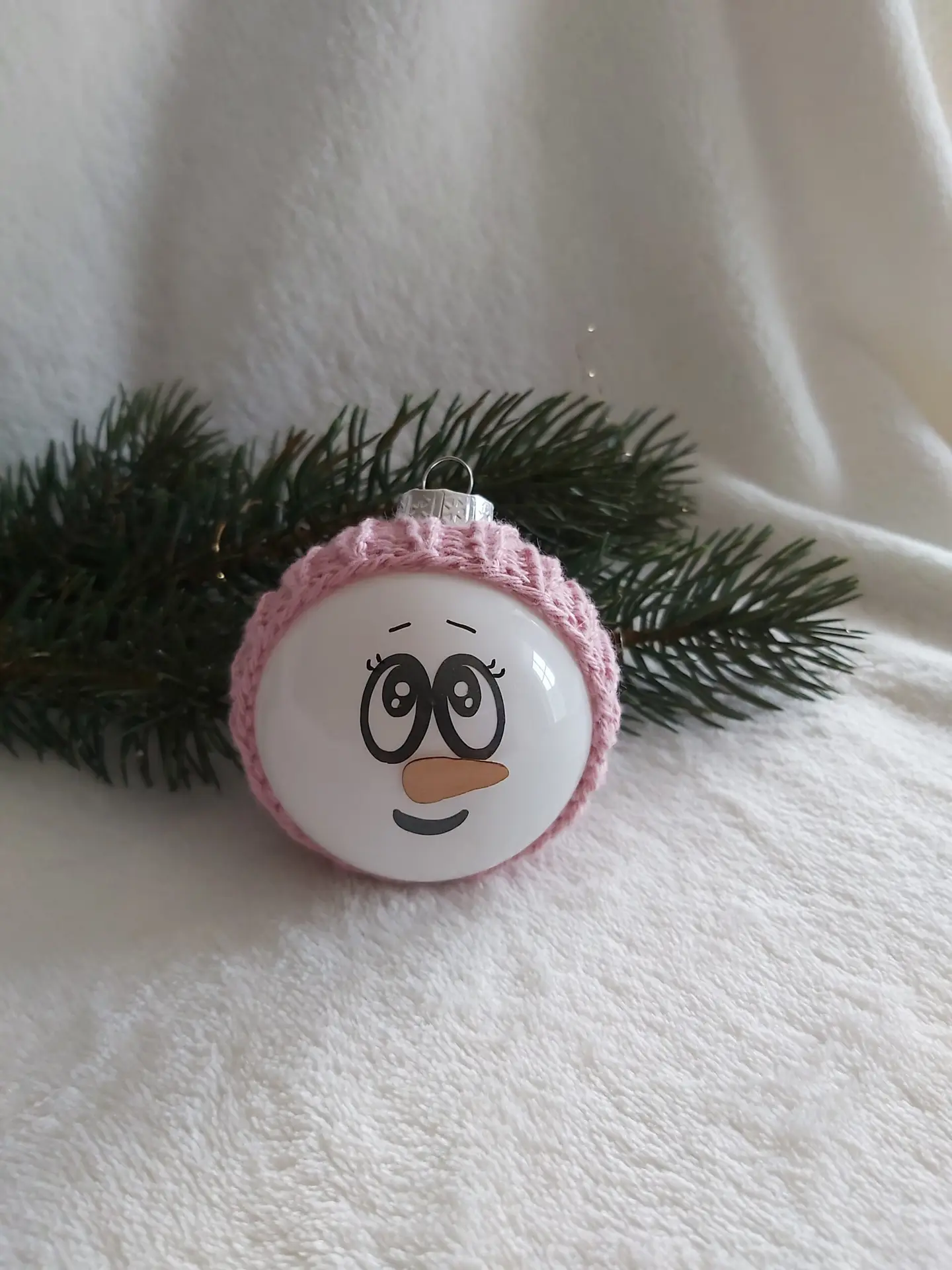 Diese individuelle Christbaumkugel ist in reiner Handarbeit gefertigt. Die Mütze wurde aus reinem Baumwollgarn gestrickt – die Karottennase aus Balsaholz gelasert.