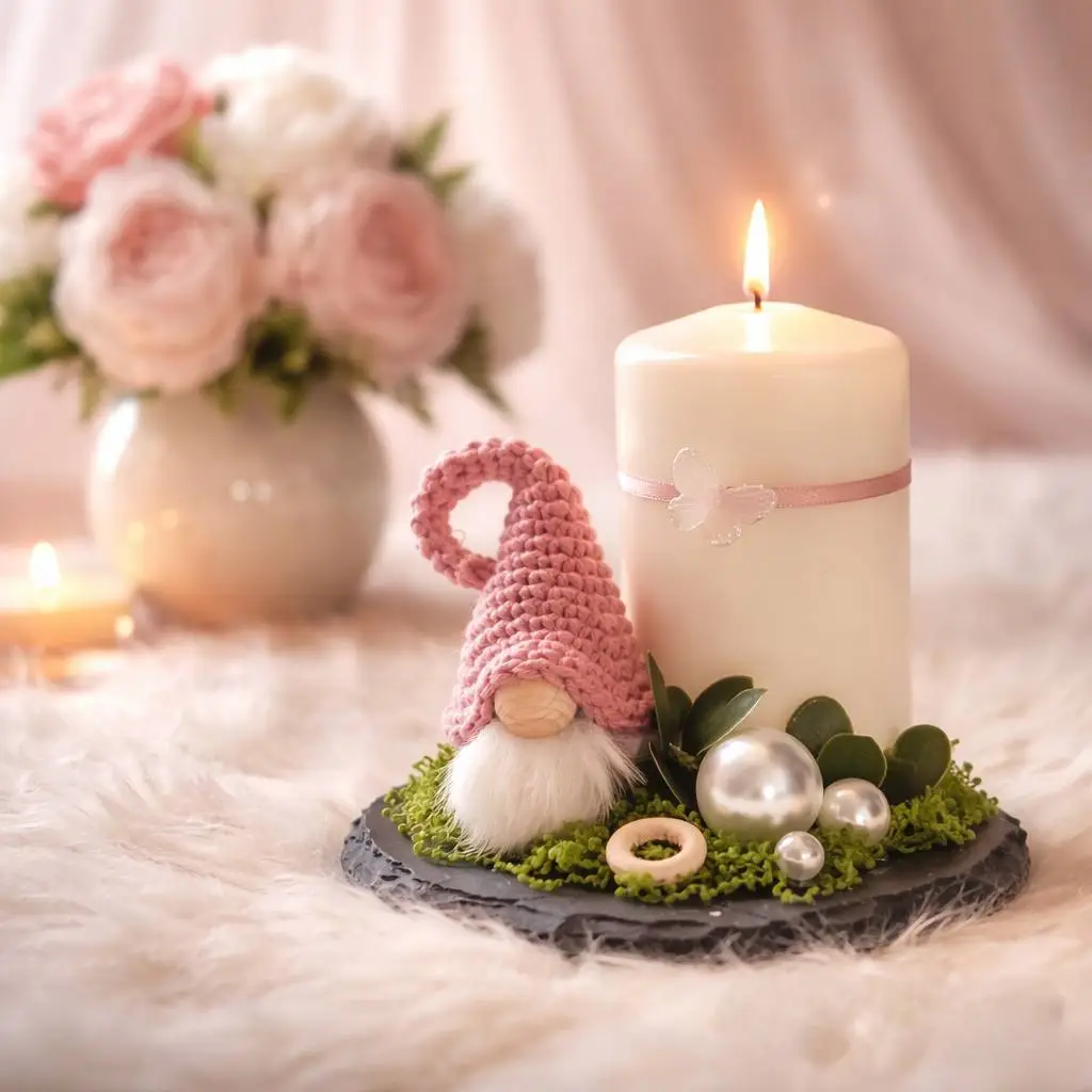 Diese Herbstdeko ist in reiner Handarbeit gefertigt. Der Wichtel ist aus reinem Baumwollgarn gehäkelt und mit einer Stumpenkerze und Dekomaterial auf einer Korkplatte aufgeklebt. Die Kerzenhöhe beträgt ca. 10 cm.