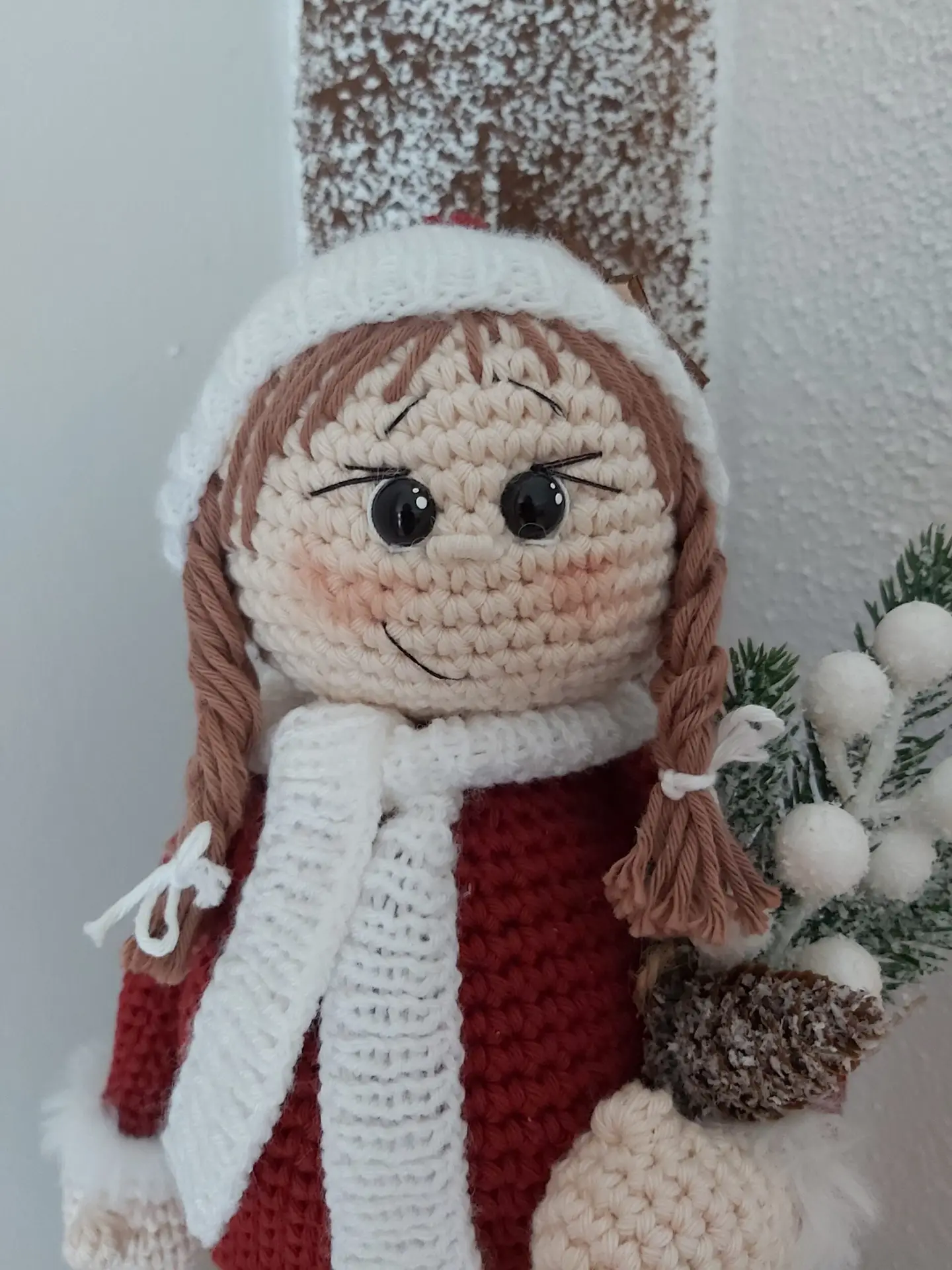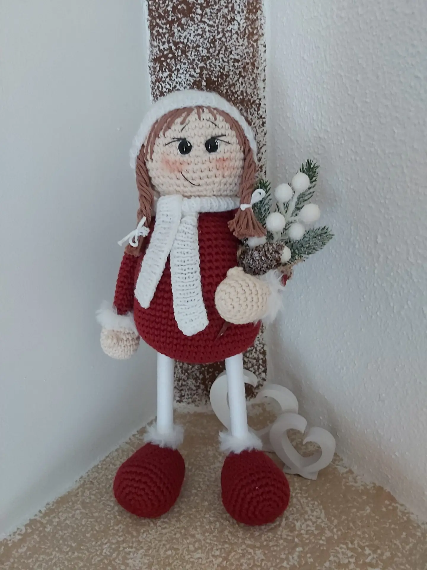 Mein Wintermädchen „Isabell“ ist aus reinem Baumwollgarn gefertigt und ca. 33 cm hoch. Isabell kann alleine stehen. Alle Teile sind angenäht oder angeklebt, ihre Augen sind Sicherheitsaugen. Meine Füllwatte ist natürlich auf Schadstoffe geprüft.